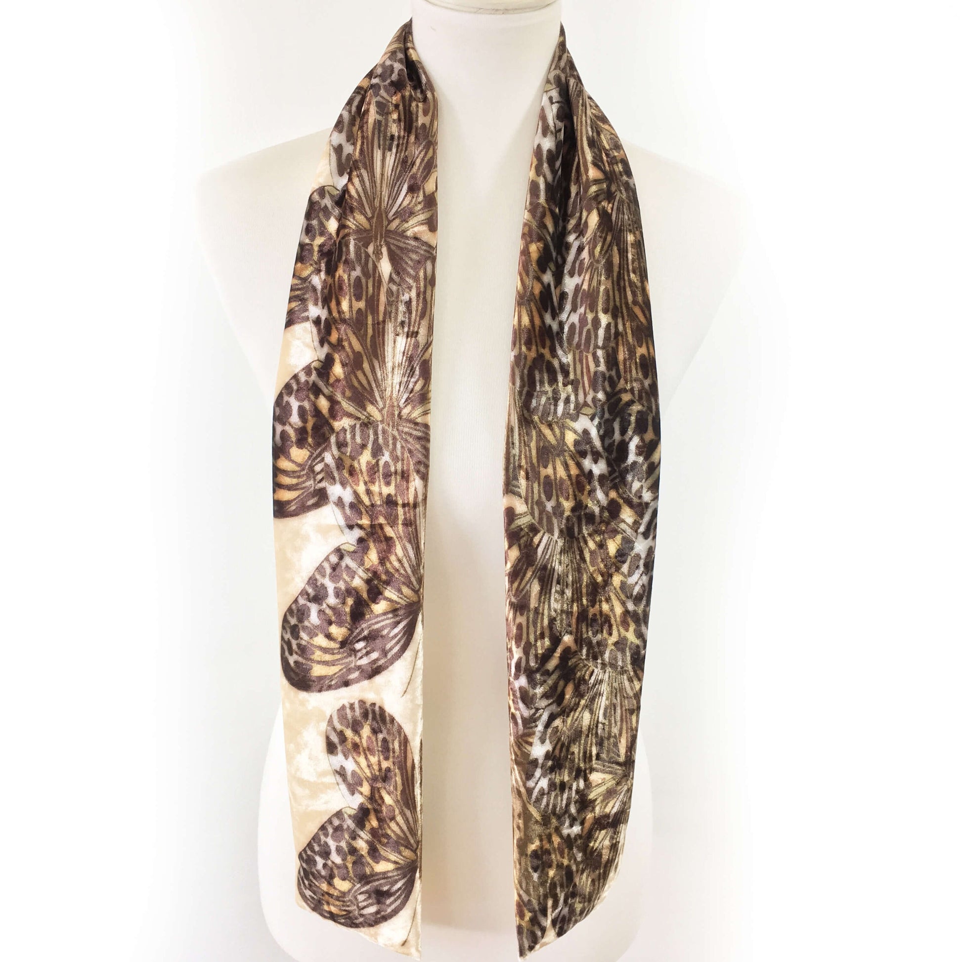 This scarf is done taking an antique butterfly print and recoloring and pulling it into a pattern. With leopard print popular this is a unique layout of leopard on one end using the butterfly wings and from the the leopard pattern emerges the butterfly. Colors are bronze browns on soft cream beige background. This is printed on both sides of the scarf. This is an all season velour that has that artsy look, can be boho, casual, or elegant from day to evening. Wear it dressed up or down, goes with jeans for a chic look or a lovely jacket or dress.